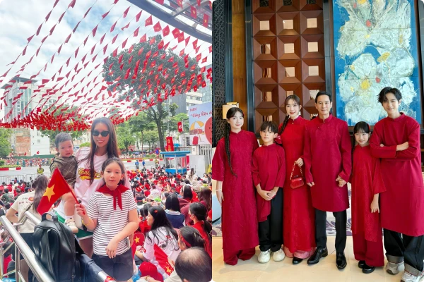 Người mẫu Hà Anh cùng hai con nhỏ xuất hiện rạng rỡ giữa không khí rộn ràng của ngày Tết Độc lập, cả ba mẹ con cùng hoà mình vào sắc cờ hoa rực rỡ đầy ý nghĩa. Trong khi đó, gia đình ca sĩ Lý Hải và vợ là Minh Hà cũng khiến người hâm mộ thích thú khi xuất hiện với trang phục áo dài đỏ nổi bật, thể hiện tinh thần tự hào dân tộc và niềm hân hoan trong dịp trọng đại của đất nước.
