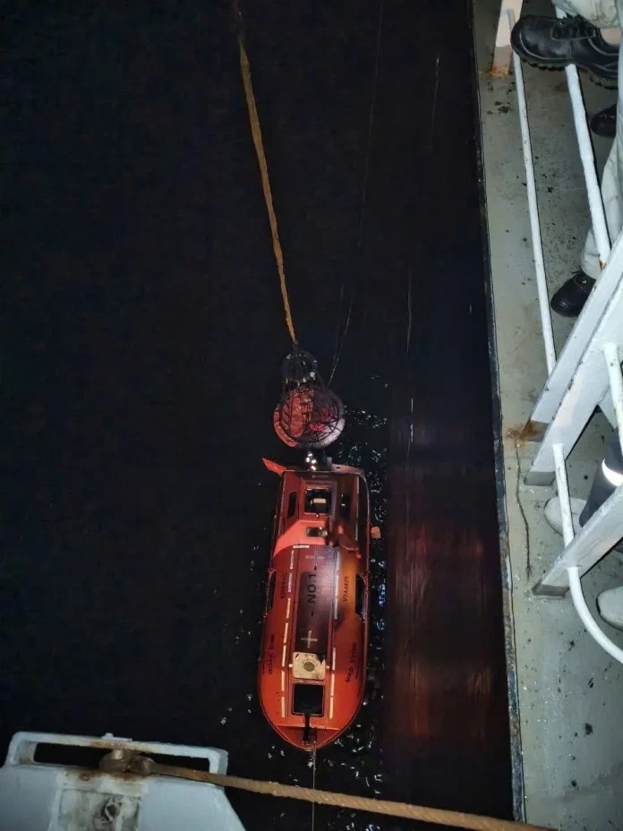 Khi ánh đèn của tàu SAND quét qua mặt biển đêm, hai chiếc xuồng cứu sinh nhỏ bé của tàu MKD VYOM hiện ra giữa đợt sóng biển cấp 3, cấp 4.